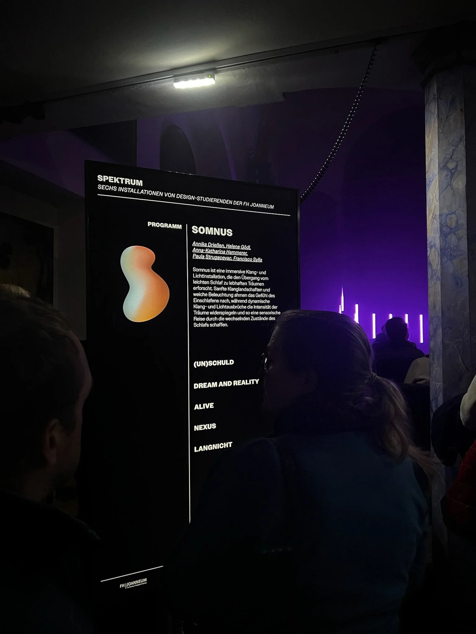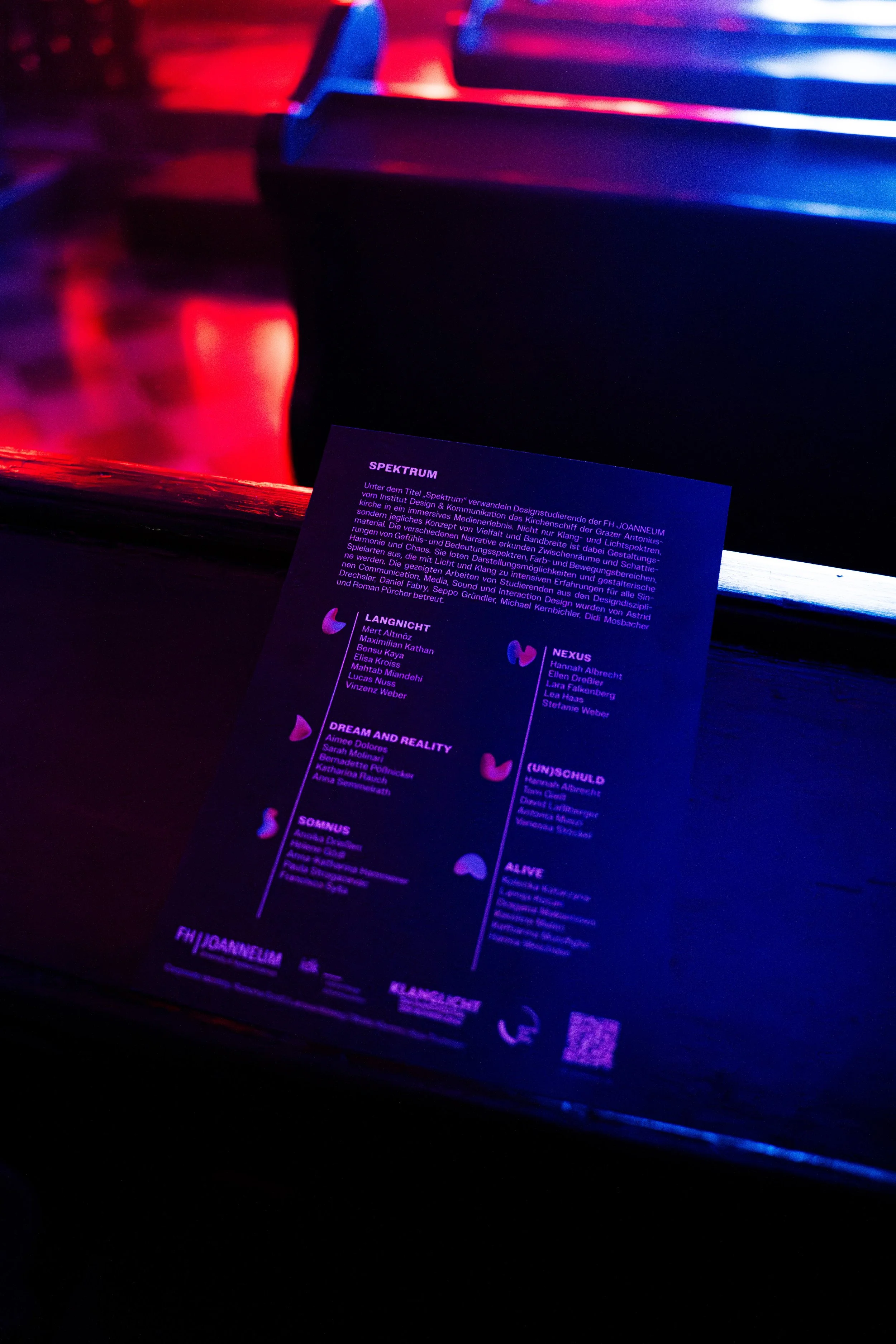 Gestaltung von Leitsystem und Branding im Rahmen des FH JOANNEUM-Projekts Spektrum für Klanglicht 2024 Präsentiert in der Antoniuskirche, inspiriert von ihrer Architektur, ihren Farben und Formen.In Kooperation mit Larissa Holweg, Ramona Groß und Maike Klemm, Fotos: Stefanie Weber